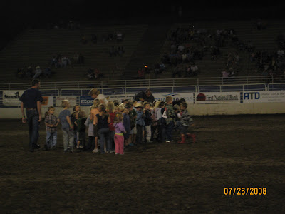 while he was standing on his horse. The best part of the evening was when all the children 5 and under got to run out to the arena and chase a sheep! The idea was to be the first one to untie the red ribbon from the sheep's belly.